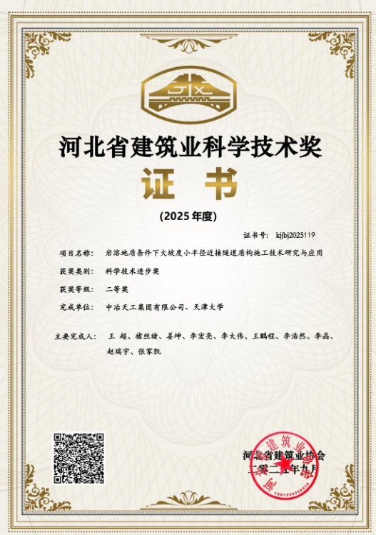 近日,由華南公司牽頭,聯(lián)合天津大學(xué)共同完成的“巖溶地質(zhì)條件下大坡度小半徑近接隧道盾構(gòu)施工技術(shù)研究與應(yīng)用”項(xiàng)目,榮獲河北省建筑業(yè)協(xié)會(huì)2025年度科學(xué)技術(shù)進(jìn)步獎(jiǎng)二等獎(jiǎng)。此項(xiàng)殊榮,標(biāo)志著華南公司在復(fù)雜地質(zhì)隧道施工技術(shù)領(lǐng)域取得了重大突破。